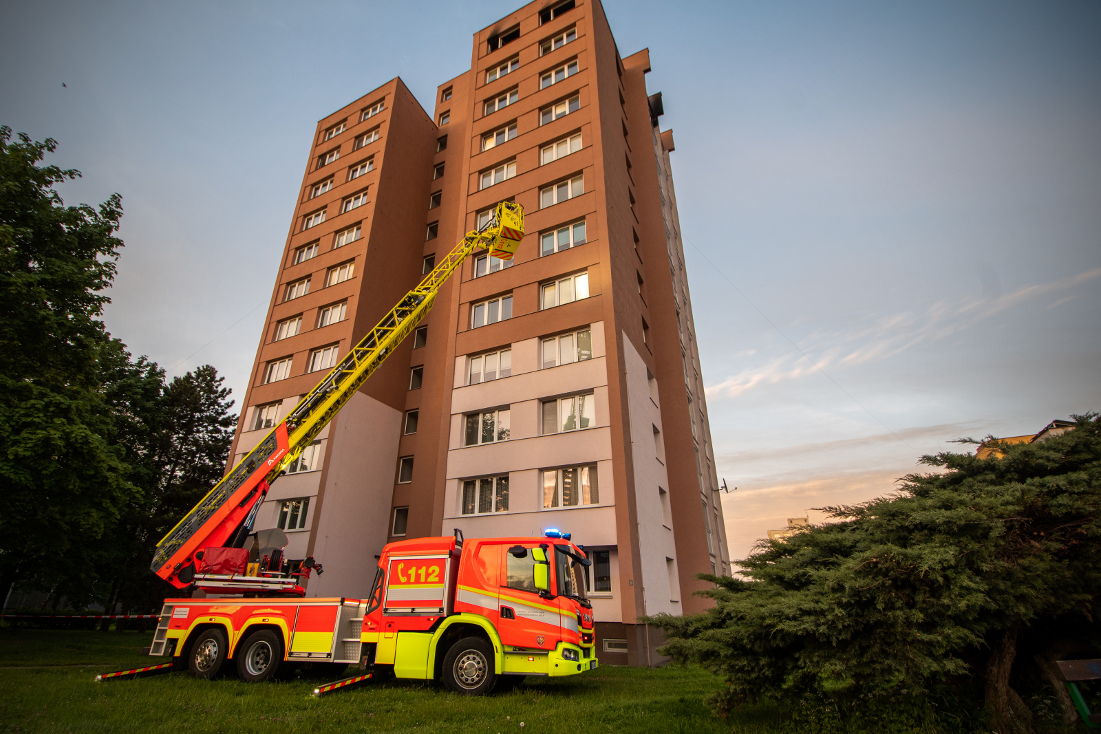 Při požáru v nejvyšším patře třináctipodlažní budovy bylo evakuováno 61 osob, 4 osoby byly zachráněny