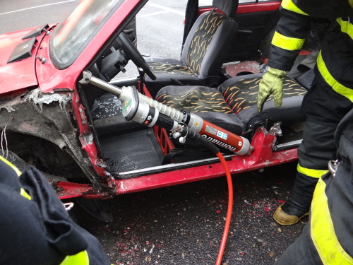 Ostravští hasiči cvičili za deště se studenty vyprošťování z havarovaného auta